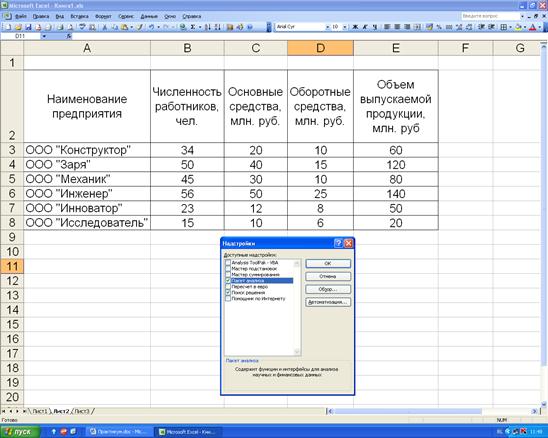 Вариант 2. Занесём исходные данные в ячейки. В диалоговом окне кликнем опцию «сервис - надстройки» и установим пакет анализа (рис. 4.6). После установки «Пакета анализа» снова кликнем опцию «сервис» и выберем операцию «анализ данных». В диалоговом окне операции «анализ данных» выберем инструмент анализа «регрессия».