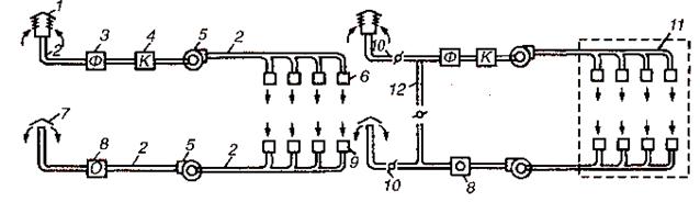 а – приточная; б – вытяжная; в – приточно-вытяжная; 1 – воздухоприемник для забора чистого воздуха; 2 – воздуховоды; 3 – фильтр для очистки воздуха от пыли; 4 – калориферы; 5 – вентиляторы; 6 – воздухораспределительные устройства (насадки); 7 – вытяжные трубы для выброса удаляемого воздуха в атмосферу; 8 – устройства для очистки удаляемого воздуха; 9 – воздухозаборные отверстия для удаляемого воздуха; 10 – клапаны для регулирования количества свежего, вторичного рециркуляционного и выбрасываемого воздуха; 11 – помещение, обслуживаемое приточно-вытяжной вентиляцией; 12 – воздуховод для системы рецикуляции