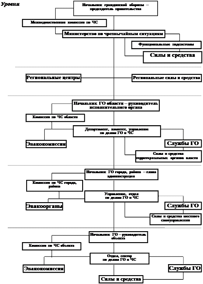 Российская система предупреждения и ликвидации чрезвычайных ситуаций имеет пять уровней управления: федеральный, региональный, территориальный, местный и объектовый. Региональный появился в результате деления России на 7 крупных регионов. Они в основном вписываются в границы существующих военных округов. Их центры размещены в Москве, Санкт-Петербурге, Екатеринбурге, Новосибирске, Красноярске, Чите и Хабаровске. Этот уровень необходим для управления войсками гражданской обороны, организации и координации взаимодействия территориальных органов исполнительной власти и управления сопредельными республиками, краями, областями в случае возникновения не только местных, но и региональных или глобальных чрезвычайных ситуаций.