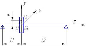 ). Точку пересечения оси вала со срединной плоскостью диска (точку крепления диска к валу) обозначим О2. Смещение этой точки будет являться прогибом вала в месте расположения диска. Будем считать, что центр масс диска расположен в точке О1 и смещён относительно оси вала (точки О2) на величину эксцентриситета e. Будем рассматривать только изгибные колебания ротора. Колебания ротора будем рассматривать в глобальной системе координат OXYZ, начало которой расположено на недеформируемой оси опор в точке ее пересечения со срединной плоскостью диска.