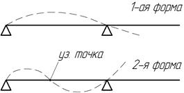 Форма колебаний – это относительное распределение перемещений по колеблющемуся телу. Каждой критической частоте соответствует одна и только одна форма колебаний (рис. 13.6). Точки, в которых амплитуда колебаний равна нулю, называются узловыми.
