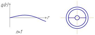 имеет одну перемену знака по радиусу диска. При этом появляется узловая окружность (см. рис. 15.2). При n=2 функция