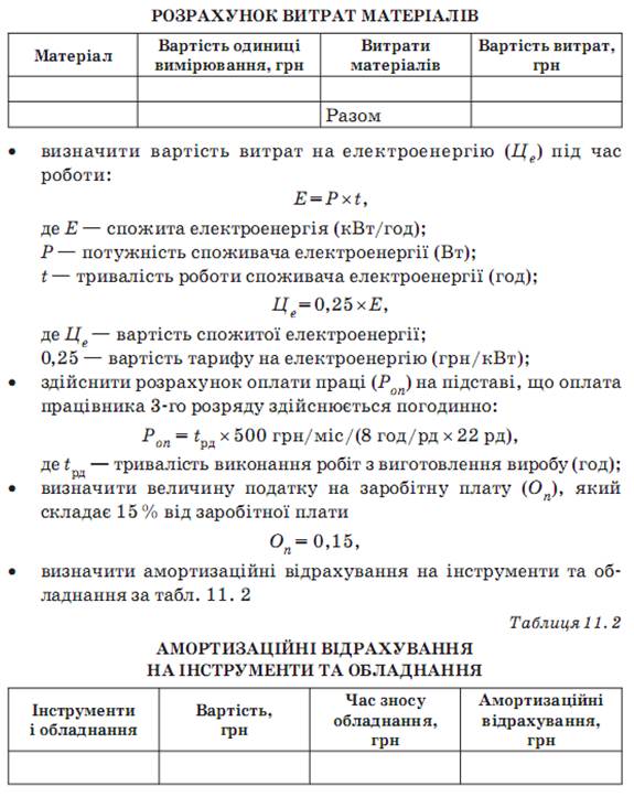 • створити електронну таблицю для визначення вартості виготовлення продукції;