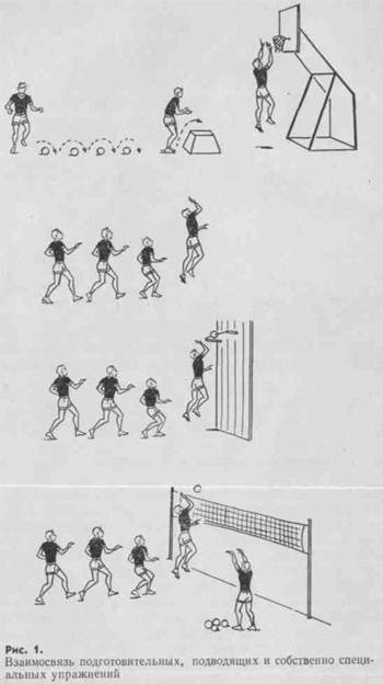 общеподготовительных упражнений создаются необходимые предпосылки для овладения основным содержанием игровой деятельности, достигается всесторонняя физическая подготовленность и оздоровление занимающихся. Ведущую роль здесь играют общеразвивающие упражнения и гигиенические факторы. Специальные подготовительные упражнения направлены на приобретение необходимых для дан-, ного вида игры физических качеств и овладение специальными двигательными навыками. Используемые с этой целью упражнения подразделяют на собственно подготовительные и подводящие. Они тесно связаны друг с другом. Подготовительными являются разнообразные упражнения без предметов и с предметами, игры и эстафеты. В качестве подводящих упражнений используют отдельные части сложнокоорди-нированного движения или всего движения в облегченных условиях. Иногда с этой целью применяют имитационные упражнения и упражнения на тренажерах. Методическая последовательность использования упражнений показана на рис. 1.