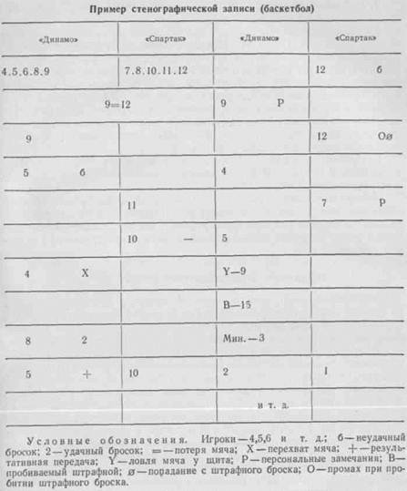Стенографическая форма записи позволяет одному наблюдателю получить разнообразные сведения в динамике об игроках обеих команд в порядке их выполнения.