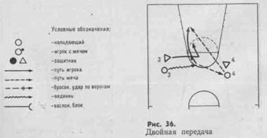Каждой тактической системе присущи свои ведущие приемы. Но все они независимо от сложности представляют собой в различных формах и сочетаниях основного элемента коллективной тактики — взаимодействия двух игроков. Два нападающих стремятся обыграть двух защитников, чтобы создать численный перевес. Инициативу освобождения от защитника чаще берет на себя игрок с мячом — он пользуется передачей мяча партнеру, выходя после этого на свободное место. Как только нападающий сумеет рывком опередить своего защитника, ему сразу же возвращают мяч. Уход от защитника облегчается тем, что в исходном положении нападающий расположен лицом, а защитник спиной к кольцу. Такой прием называют двойной передачей (или «отдай и выходи»; рис. 36).
