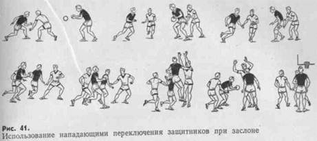 Использование заслона успешно в тех случаях^ когда ставят его в опасной для кольца соперника зоне неожиданно и сопровождают выходом к кольцу заслоняющего игрока. Последнее особенно важно, так как позволяет воспользоваться замешательством соперника и его невыгодным положением по отношению к одному из нападающих, а также преимуществом в росте при переключении защитников разного роста (рис. 41).