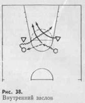 Другая разновидность заслона выполняется для игрока с мячом.. После передачи игрок, решивший поставить заслон, двигается в направлении защитника, опекающего игрока с мячом. Приблизившись к нему на 1—2 м, он резко меняет направление и уходит к щиту. Игрок с мячом обходит его сзади, а защитник наталкивается на передавшего мяч игрока (рис. 38). Такой заслон называют внутренним, так как нападающий оказывается между двумя защитниками.