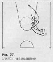 Свой выход игрок может рассчитать так, что защитнику трудно будет преследовать его; он натолкнется на владеющего мячом или любого другого игрока. Такой прием освобождения с помощью партнера используют широко и называют заслоном «наведением» (рис. 37).