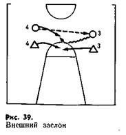 Нападающий может помешать защитнику и тогда, когда он располагается или двигается между своим партнером и защитником (рис. 39). Игрок с мячом получает возможность сразу бросать в кольцо или пройти с мячом в более удобную позицию, используя столкновение защитников. Такой заслон называют внешним.