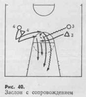 Чтобы помешать смене игроков, освобождающийся игрок может начать движение одновременно с уходом партнера и параллельно. Такой заслон называют заслоном с сопровождением (рис. 40).