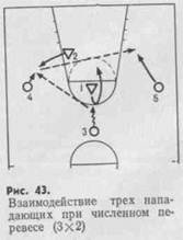 Трое нападающих при численном перевесе преследуют ту же цель — создать одному игроку условия для беспрепятственного броска по кольцу. Оказавшись перед двумя защитниками (рис. 43), нападающие стремятся занять выгодные позиции, образовав у щита треугольник. Игрок с мячом двигается к корзине, вызывая на себя атаку защитников. Как только один из защитников выйдет к нему, мяч передается открытому партнеру. Этот игрок завершает атаку сам либо передает мяч свободному нападающему.