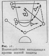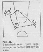 ходят к кольцу одновременно и параллельно друг другу. К смене мест при встречном передвижении почти не прибегают. ■ Разнообразнее и эффективнее взаимодействие трех нападающих, действующих против трех защитников. Наиболее распространенные