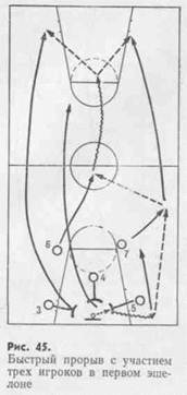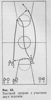 Проще всего осуществить нападение быстрым прорывом после перехвата мяча. В таких случаях прорыв обычно выполняют один-два игрока. Перехвативший мяч чаще всего сам устремляется к кольцу. Второй игрок поддерживает его, если возникает необходимость передать или подобрать мяч. Нападающие двигаются по центру параллельно друг другу (рис. 44). В завершающей фазе атаки оба они выходят к щиту. Если в этой фазе против них будет действовать равное число защитников, то нападающие могут использовать смену мест и заслоны, индивидуальные проходы и броски с 4—5 м с последующей борьбой за отскок.