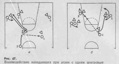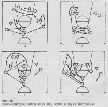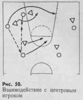 Когда центр располагается у щита при расстановке 3—2, 1—2—2, одна из главных задач нападающих — помочь ему получить мяч и обыграть защитника. С этой целью используют различные варианты группового взаимодействия.