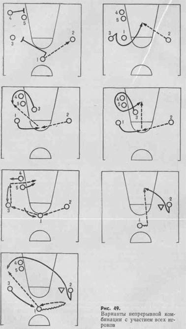 Существуют также и более сложные варианты, в которых действуют центровые игроки и разнообразные заслоны (рис. 49).