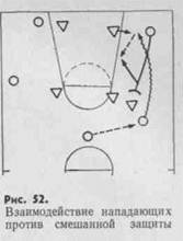 Смешанная защита ставит перед нападением дополнительные трудности: она прочна, и, чтобы преодолеть ее, необходима особая тактика.