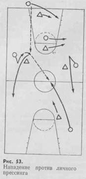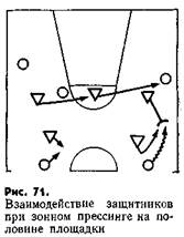 Как только игрок с мячом появляется за средней линией, его сразу же атакует ближайший защитник. К атаке на ведущего подключается защитник, в зону которого ведет мяч нападающий. Остальные игроки смещаются, оставляя свободными игроков на дальней от мяча стороне, и перекрывают возможные направления передачи мяча под щит и поперек площадки. Особенно энергично атакуют игрока, ведущего мяч вдоль ограничивающих линий площадки (рис. 71).