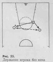 Несколько отличается держание центрового игрока. Здесь защитник прежде всего старается предотвратить возможность получить мяч. Поэтому он располагается между мячом и игроком (сбоку или впереди от него). При держании игрока с мячом важно правильно рассчитать расстояние и выбрать нужную стойку. Сближаясь с нападающим, защитник должен занять такую позицию, чтобы успеть помешать броску и в то же время не дать обойти себя. Для этого целесообразно использовать низкую стойку с выставленной вперед ногой. Сближаясь с нападающим и используя финты, защитник старается вызвать его на незапланированные действия.