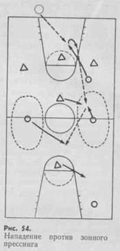 Подобным же образом действуют три защитника против четырех нападающих. В области штрафного броска защитники располагаются треугольником. Как только один из них начинает атаку на игрока с мячом, другие стремятся перехватить мяч.
