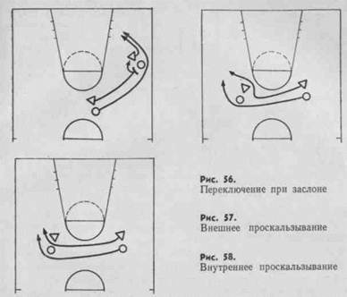 Различают внешнее и внутреннее проскальзывание. При внешнем проскальзывании защитник обходит мешавшую ему пару игроков (рис. 57), при внутреннем проходит между другим нападающим и опекающим его игроком (рис. 58). Второй защитник в это время делает шаг назад. Внешнее проскальзывание предпочтительнее, поскольку оно позволяет сохранить постоянный контроль над нападающим. Оно используется чаще в тех случаях, когда второй нападающий не владеет мячом.