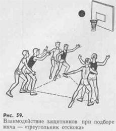 Взаимодействуя у щита, защитники стремятся образовать «треугольник отскока», чтобы овладеть отскочившим мячом.
