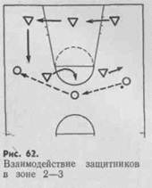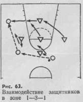 нение этого варианта возможно во встречах с командами, имеющими двух рослых центровых игроков. Чтобы успешно бороться с такими командами, защищающиеся плотно держат трех -полевых игроков, в то время как два высоких защитника играют в зонах под щитом.
