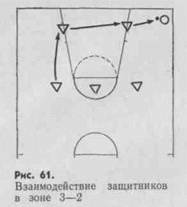 Зона 3—2. Этот вариант используют против команд, ведущих атаку бросками с дистанции и индивидуальными проходами к щиту. Два рослых защитника занимают зоны под щитом, а трое выдвигаются за линию штрафного броска. Труднее всего здесь бороться с бросками из углов площадки. Эту угрозу ликвидируют выходом из-под щита ближайшего защитника. Второй защитник смещается в этом же направлении, и зону, освободившуюся под щитом, занимает один из игроков первой линии (рис. 61).