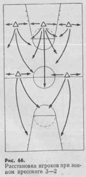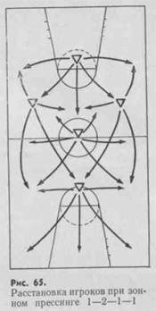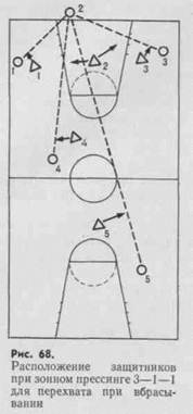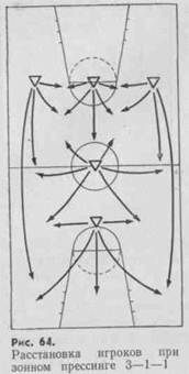 Расстановка игроков при зонном прессинге 3—1—1 показана на; рис. 68.