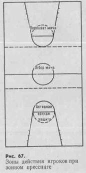 Действия играющих определяются местом мяча на площадке. Условно выделяют три зоны действия (рис. 67).