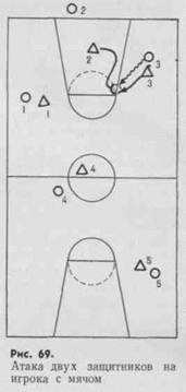 Если перехватить первую передачу им не удается, то они перестраиваются и начинают организовывать давление на игрока, получившего : мяч. Опекающий игрок сближается с ним и атакой со стороны боковой линии вынуждает его к ведению к центру площадки. Здесь его встречает игрок 2, и вместе с игроком 3 они стараются остановить его и отобрать мяч. Остальные играют вперехват (рис. 69).