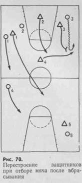 В момент броска по кольцу ближайшие к щиту защитники обязаны обеспечить подбор мяча. Преградив нападающим путь, они с трех сторон выходят к щиту и в прыжке овладевают мячом (рис.