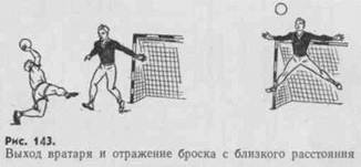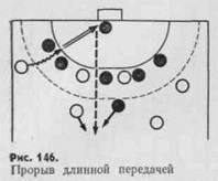 Один из вариантов атаки длинной передачей показан на рис. 146. Поймав мяч, вратарь передает его бегущему в прорыв игроку. Остальные партнеры немедленно включаются в атаку, стараясь опередить ближайших защитников.