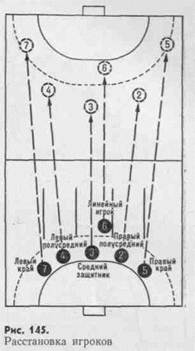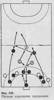 ушедших вперед игроков (рис. 147). В этом случае в прорыв устремляются все игроки. Занимая всю ширину площадки, они двигаются двумя линиями на расстоянии нескольких метров одна от другой. Передачи выполняют быстро и по возможности вперед, не входя в соприкосновение с защитниками. Возникающий в начале атаки численный перевес обычно реализуют броском из площади вратаря.