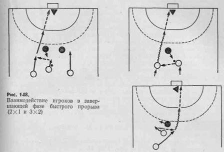 Групповые действия при быстром прорыве. Быстрый прорыв складывается из трех фаз: овладение мячом и переход от защиты к нападению, маневр в движении по площадке, за- -вершение атаки. В начале атаки важно своевременно начать отрыв от защитников, правильно выбрать направление выхода и быстро передать мяч игроку. Поэтому основная форма взаимодействия между двумя игроками в этой фазе атаки ■— передача на выход отрывающемуся игроку. Чтобы избежать перехвата, выходящий должен двигаться под углом к воротам, преграждая защитнику выход к мячу. Передающий игрок должен правильно выбрать направление и траекторию передачи. Чаще дру-