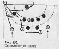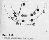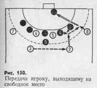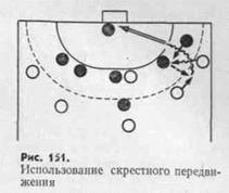 К числу эффективных способов освобождения от защитников относится передача мяча игроку, выходящему на свободное место (рис. 150), смена при скрестном и встречном передвижении (рис. 151), одиночный и групповой заслоны (рис. 152), сковывающая атака — имитация прохода между двумя защитниками с последующей передачей мяча освободившемуся партнеру (рис. 153).