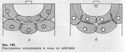 с одним линейным игроком (расстановка 3—3 — рис. 149, а) и с двумя (расстановка 4—2 — рис. 149, б).