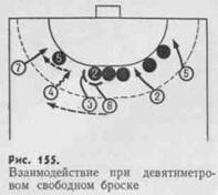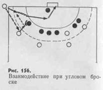 в стандартных положениях (при девятиметровом свободном броске, угловом или штрафном броске и при неравных составах команд). При девятиметровом свободном броске обычно используют один из вариантов группового заслона (рис. 155). Угловой бросок стремятся завершить атакой с близкой дистанции (рис. 156).