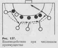 При численном преимуществе используют атаку с выходом двух нападающих к линии площади вратаря (рис. 157).