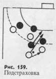 Подстраховка означает создание численного перевеса на главном направлении атаки — защитники смещаются к партнеру, атакующему игрока с мячом. С обеих сторон к нему приближаются защитники, создавая «защитный треугольник» (рис. 159).