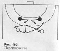 Переключения используют при заслонах, встречных и скрестных перемещениях, смене мест нападающими. Сблизившись друг с другом, защитники по сигналу обмениваются подопечными игроками (рис. 160).