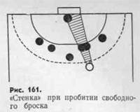 броска, когда нападающие образуют «стенку» перед воротами (рис. 161), а также непосредственно в игре. В таком случае обычно взаимодействуют два защитника, перекрывающие возможные броски в углы