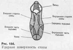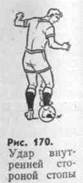 Удар внутренней стороной стопы осуществляют ногой, развернутой носком наружу (рис. 170). Опорную ногу, согнутую в колене, ставят несколько сбоку от мяча; бьющую ногу, слегка согнутую в колене, поворачивают в тазобедренном суставе наружу. Удар выполняют с небольшим замахом и резким движением напряженной ногой с закрепленным голеностопным суставом.