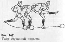 Удар серединой подъема. Называется он так потому, что бьющая нога с оттянутой стопой соприкасается с мячом серединой подъема (рис. 167).