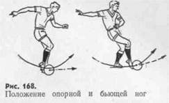 лене, ставят чаще всего с пятки и по мере движения бьющей. ноги вперед сгибают еще больше, вес тела переносят на всю ступню; затем, в момент отрыва мяча от стопы, поднимаются на носок.
