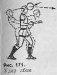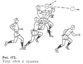 При ударе по мячу, летящему слева, положение соответственно меняется. Удар лбом и боковой частью головы часто выполняют в прыжке (рис. 172).