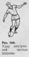 Удар внутренней частью подъема наносят частью стопы, прилегающей к большому пальцу и несколько выше (рис. 169). Согнутую в колене опорную ногу ставят несколько позади и сбоку мяча, а бьющую отводят при замахе назад и несколько внутрь. Туловище во время удара правой ногой отклоняют влево, а при ударе левой — вправо. Удар может быть произведен как с прямого разбега, так и под углом к направлению полета мяча. Чтобы направить мяч низко, надо в момент удара колено бьющей ноги вывести вперед, оттянуть стопу вниз и ударить в среднюю часть мяча.
