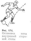 Остановка внутренней стороной стопы мяча, катящегося навстречу, выполняется так: игрок поворачивает ногу носком наружу, вес тела переносит на опорную ногу, в момент соприкосновения с мячом ногу отводит немного назад, уступая движению мяча (рис. 174). При остановке мяча, падающего сверху, расслабленную ногу следует отвести назад (если мяч опускается навстречу) или в сторону (если он опускается сбоку).