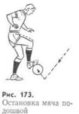 Остановку ногой выполняют подошвой, внутренней и внешней сторонами стопы, серединой подъема, голенью, бедром и носком. Для остановки катящегося мяча подошвой игрок мягко встречает его ногой, слегка согнутой в колене и вынесенной вперед (носок поднят, пятка опущена). Туловище слегка наклоняет над мячом. Если мяч опускается, то прежде всего надо рассчитать место его приземления и остановить выставленной вперед ногой, слегка согнув ее в колене. Для полной остановки носок опускают, прижимая мяч к земле. В момент соприкосновения мяча с землей его накрывают подошвой (рис. 173). При неполной остановке мяча в момент соприкосновения с подошвой останавливающую ногу немного поднимают. Тогда мяч отходит несколько вперед или в сторону от ноги.