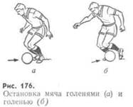 Остановку мяча голенями (голенью) осуществляют следующим образом: в момент соприкосновения мяча с землей игрок сгибает сомкнутые в коленях ноги, становясь на носки. Мяч при отскоке от земли ударяется о голени (голень) и останавливается перед игроком (рис. 176).